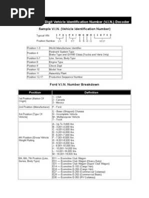 This first position of the vin is an identifier of the country or final assembly point of the ford. Look up vehicle identification numbers for all car makes and vehicle models by year from ford. Each vin has captures unique information belonging to that specific make and model vehicle.
